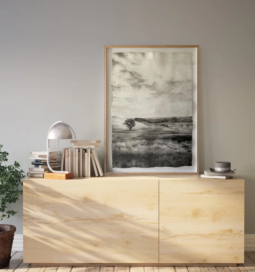 The View (2023) Charcoal and acrylic paint on board, framed in light oak, 62 x 92cm. AVAILABLE